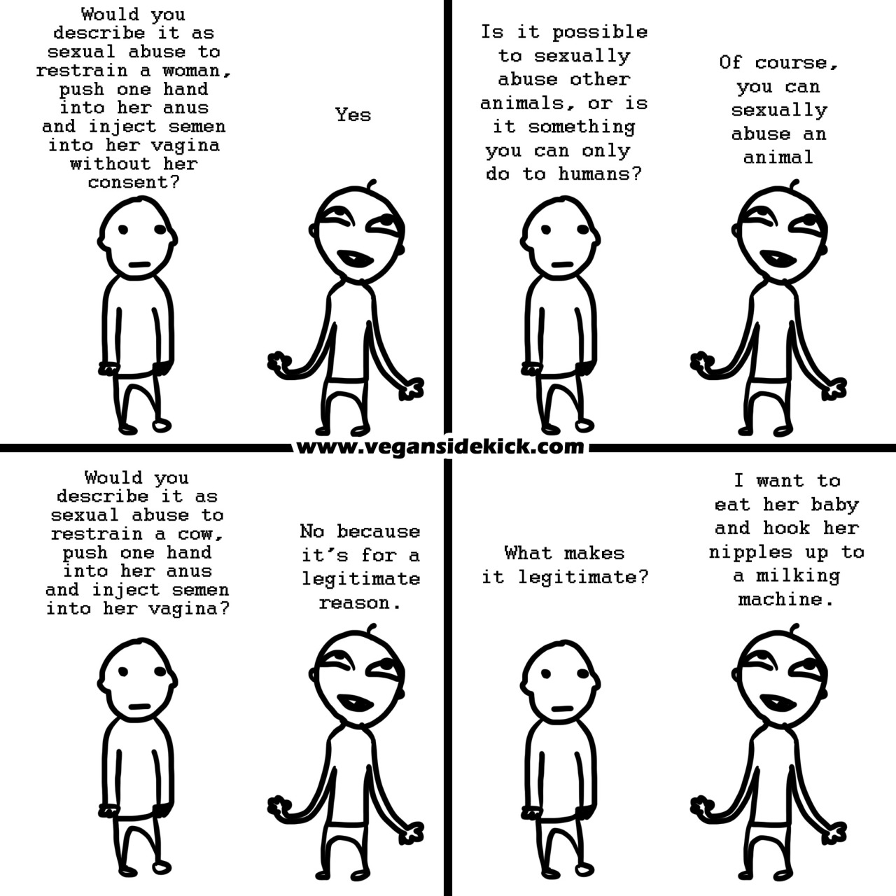 In the case of a well cared for dairy cow, she is forcibly inseminated repeatedly through her life (annually), made to give birth year after year, having her children removed from her immediately against her will (to either be killed as veal or follow her in to the same life), unduring daily milkings aided by supplements and careful breeding and sometimes hormones to unsure she has the largest breasts possible, and maintained in conditions ranging from confined spaces to enclosed paddocks she cannot escape (should she wish it).