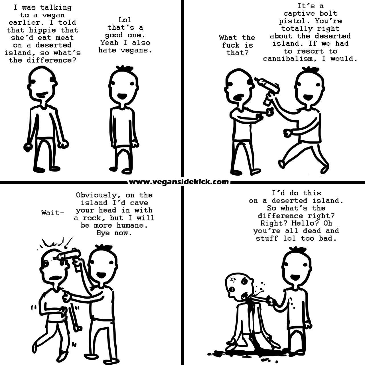 As vegans, we are commonly asked the “deserted island” question. “Sure, you’re vegan, but what if you were stranded on a desert island…what would you eat then?” The simple answer is, “Whatever plants the animals are eating.” To take this a step further, I’d like to pose that those same people answer this question: if a toddler was placed on an uncharted island with abundant wildlife and plant life, would the child grow up a vegan or a meat-eater?