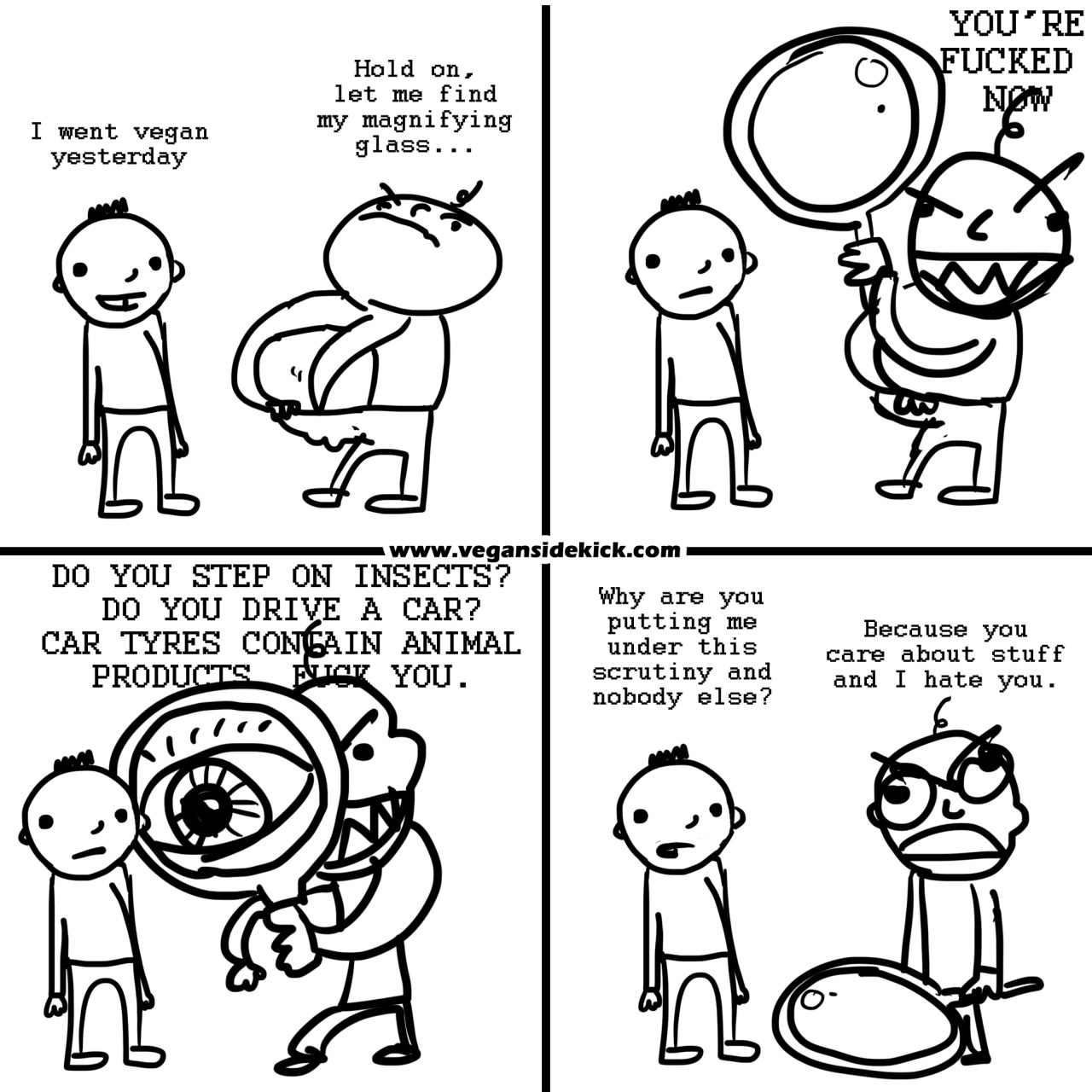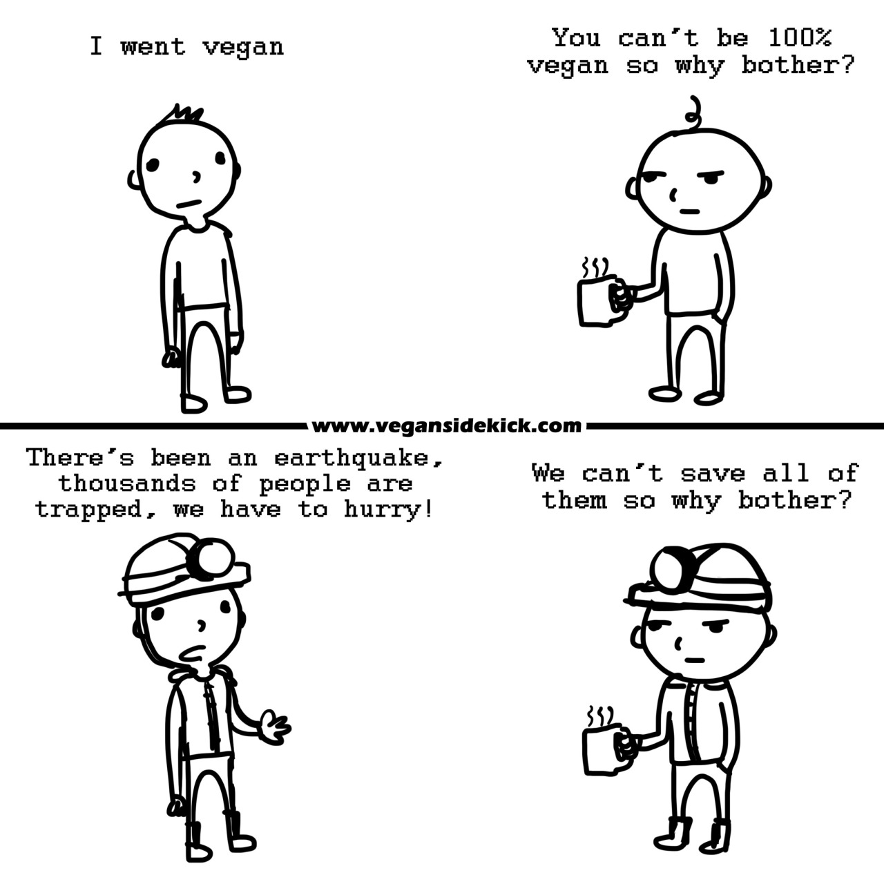 The perfect vegan uses their life as a statement that wearing, exploiting, killing and eating other animals is fundamentally wrong. He/she will inconvenience themselves and always verify ingredients, bring their own food when travelling, etc. because they are making a stand, with their life’s actions, knowing it’s not really much of an inconvenience compared to the holocaust that other animals are facing every day at the hands of humanity. Auschwitz happened because of racism…slaughterhouses happen because of speciesism. The perfect vegan wants no part, not even minuscule. The perfect vegan does not want complicity in the crimes against nonhumanity.